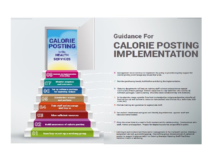 Implementation of Calorie Posting Standardise standardising recipes &portions Set up software package for inputting recipes and sourcing calorie information Monitor progress & outcomes before during and after http: //www. hse. ie/eng/health/hl/calorieposting. html Maintain the implementation of the policy