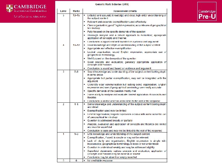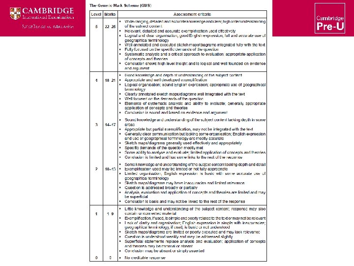 Assessment • The Cambridge Pre-U Certificate in Geography is assessed through four compulsory components • The assessment is linear and takes place at the end of the 2 year course; a single grade is awarded for the qualification • Results: Distinction, Merit and Pass are published for each component. • Experienced examiners familiar with A Level standards • Criterion referenced • Track record – 6 years of consistent, high quality assessment