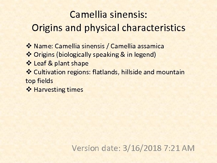 Camellia sinensis: Origins and physical characteristics v Name: Camellia sinensis / Camellia assamica v Origins (biologically speaking & in legend) v Leaf & plant shape v Cultivation regions: flatlands, hillside and mountain top fields v Harvesting times Version date: 3/16/2018 7: 21 AM
