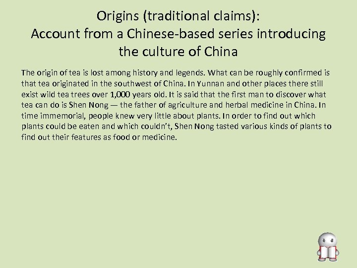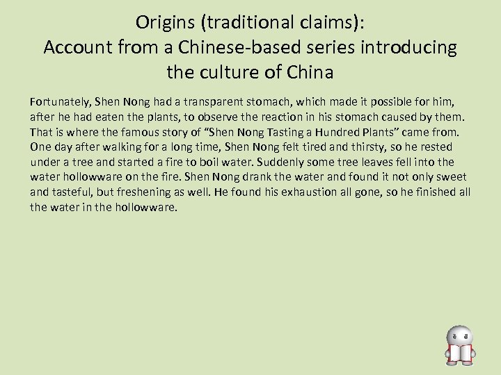 Origins (traditional claims): Account from a Chinese-based series introducing the culture of China Fortunately, Shen Nong had a transparent stomach, which made it possible for him, after he had eaten the plants, to observe the reaction in his stomach caused by them. That is where the famous story of “Shen Nong Tasting a Hundred Plants” came from. One day after walking for a long time, Shen Nong felt tired and thirsty, so he rested under a tree and started a fire to boil water. Suddenly some tree leaves fell into the water hollowware on the fire. Shen Nong drank the water and found it not only sweet and tasteful, but freshening as well. He found his exhaustion all gone, so he finished all the water in the hollowware.