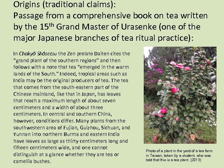 Origins (traditional claims): Passage from a comprehensive book on tea written by the 15 th Grand Master of Urasenke (one of the major Japanese branches of tea ritual practice): In Chakyô Shôsetsu the Zen prelate Daiten cites the “grand plant of the southern regions” and then follows with a note that tea “emerged in the warm lands of the South. ” Indeed, tropical areas such as India may be the original producers of tea. The tea that comes from the south-eastern part of the Chinese mainland, like that in Japan, has leaves that reach a maximum length of about seven centimeters and a width of about three centimeters. In central and southern China, however, conditions differ. Many plants from the southwestern area of Fujian, Guizhou, Sichuan, and Yunnan into northern Burma and eastern India have leaves as large as thirty centimeters long and fifteen centimeters wide, and one cannot distinguish at a glance whether they are tea or camellia bushes. Photo of a plant in the yard of a tea farm in Taiwan, taken by a student, who was told that this is a tea plant. (2013)