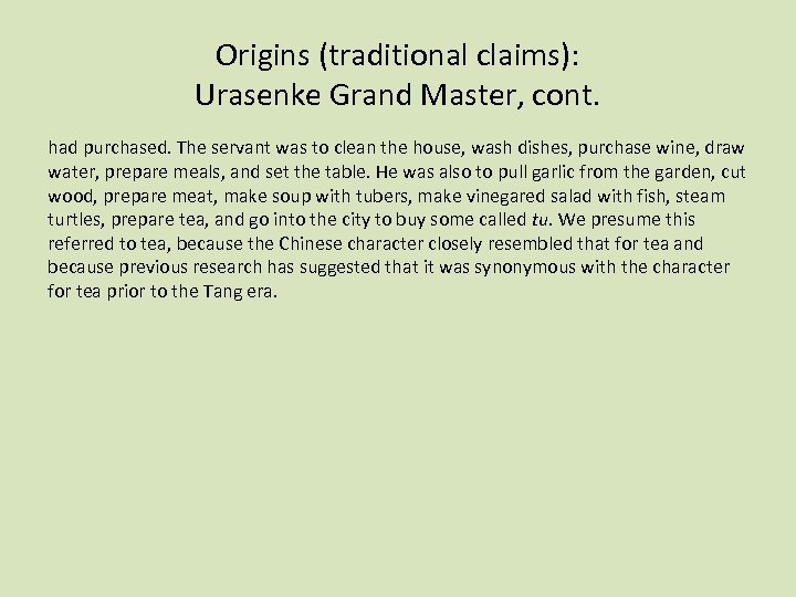 Origins (traditional claims): Urasenke Grand Master, cont. had purchased. The servant was to clean the house, wash dishes, purchase wine, draw water, prepare meals, and set the table. He was also to pull garlic from the garden, cut wood, prepare meat, make soup with tubers, make vinegared salad with fish, steam turtles, prepare tea, and go into the city to buy some called tu. We presume this referred to tea, because the Chinese character closely resembled that for tea and because previous research has suggested that it was synonymous with the character for tea prior to the Tang era.