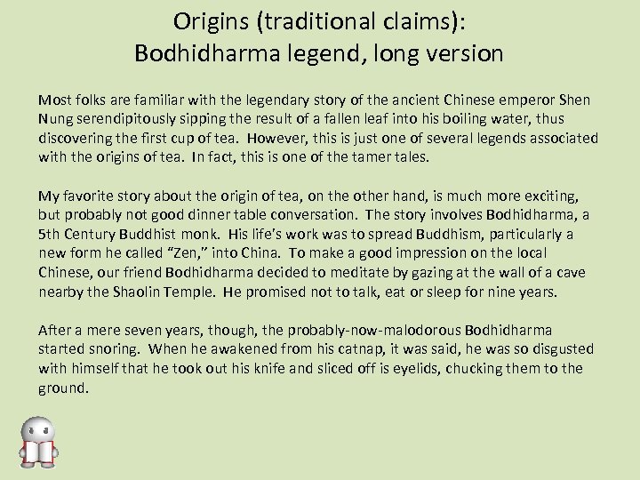 Origins (traditional claims): Bodhidharma legend, long version Most folks are familiar with the legendary story of the ancient Chinese emperor Shen Nung serendipitously sipping the result of a fallen leaf into his boiling water, thus discovering the first cup of tea. However, this is just one of several legends associated with the origins of tea. In fact, this is one of the tamer tales. My favorite story about the origin of tea, on the other hand, is much more exciting, but probably not good dinner table conversation. The story involves Bodhidharma, a 5 th Century Buddhist monk. His life’s work was to spread Buddhism, particularly a new form he called “Zen, ” into China. To make a good impression on the local Chinese, our friend Bodhidharma decided to meditate by gazing at the wall of a cave nearby the Shaolin Temple. He promised not to talk, eat or sleep for nine years. After a mere seven years, though, the probably-now-malodorous Bodhidharma started snoring. When he awakened from his catnap, it was said, he was so disgusted with himself that he took out his knife and sliced off is eyelids, chucking them to the ground.