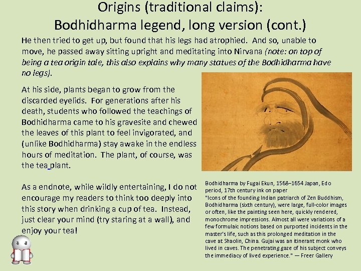Origins (traditional claims): Bodhidharma legend, long version (cont. ) He then tried to get up, but found that his legs had atrophied. And so, unable to move, he passed away sitting upright and meditating into Nirvana (note: on top of being a tea origin tale, this also explains why many statues of the Bodhidharma have no legs). At his side, plants began to grow from the discarded eyelids. For generations after his death, students who followed the teachings of Bodhidharma came to his gravesite and chewed the leaves of this plant to feel invigorated, and (unlike Bodhidharma) stay awake in the endless hours of meditation. The plant, of course, was the tea plant. As a endnote, while wildly entertaining, I do not encourage my readers to think too deeply into this story when drinking a cup of tea. Instead, just clear your mind (try staring at a wall), and enjoy your tea! Bodhidharma by Fugai Ekun, 1568– 1654 Japan, Edo period, 17 th century ink on paper "Icons of the founding Indian patriarch of Zen Buddhism, Bodhidharma (sixth century), were large, full-color images or often, like the painting seen here, quickly rendered, monochrome impressions. Almost all were variations of a few formulaic notions based on purported incidents in the master's life, such as this prolonged meditation in the cave at Shaolin, China. Gujai was an itinerant monk who lived in caves. The penetrating gaze of his subject conveys the immediacy of lived experience. " — Freer Gallery