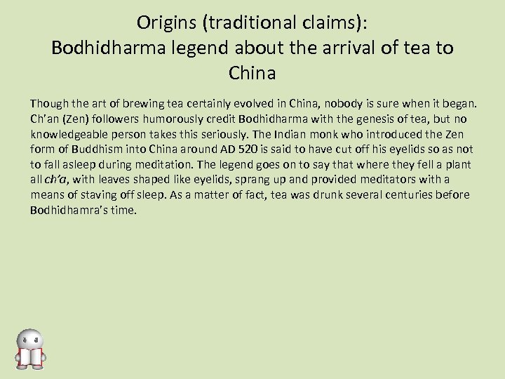 Origins (traditional claims): Bodhidharma legend about the arrival of tea to China Though the art of brewing tea certainly evolved in China, nobody is sure when it began. Ch’an (Zen) followers humorously credit Bodhidharma with the genesis of tea, but no knowledgeable person takes this seriously. The Indian monk who introduced the Zen form of Buddhism into China around AD 520 is said to have cut off his eyelids so as not to fall asleep during meditation. The legend goes on to say that where they fell a plant all ch’a, with leaves shaped like eyelids, sprang up and provided meditators with a means of staving off sleep. As a matter of fact, tea was drunk several centuries before Bodhidhamra’s time.