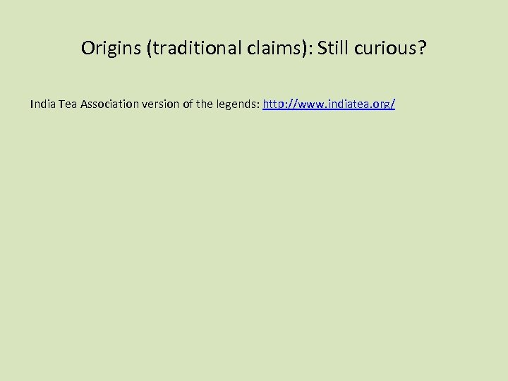 Origins (traditional claims): Still curious? India Tea Association version of the legends: http: //www. indiatea. org/