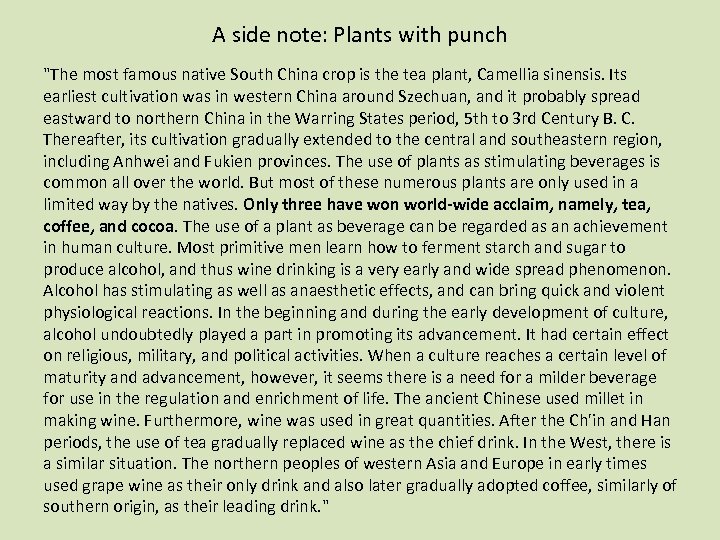 A side note: Plants with punch "The most famous native South China crop is the tea plant, Camellia sinensis. Its earliest cultivation was in western China around Szechuan, and it probably spread eastward to northern China in the Warring States period, 5 th to 3 rd Century B. C. Thereafter, its cultivation gradually extended to the central and southeastern region, including Anhwei and Fukien provinces. The use of plants as stimulating beverages is common all over the world. But most of these numerous plants are only used in a limited way by the natives. Only three have won world-wide acclaim, namely, tea, coffee, and cocoa. The use of a plant as beverage can be regarded as an achievement in human culture. Most primitive men learn how to ferment starch and sugar to produce alcohol, and thus wine drinking is a very early and wide spread phenomenon. Alcohol has stimulating as well as anaesthetic effects, and can bring quick and violent physiological reactions. In the beginning and during the early development of culture, alcohol undoubtedly played a part in promoting its advancement. It had certain effect on religious, military, and political activities. When a culture reaches a certain level of maturity and advancement, however, it seems there is a need for a milder beverage for use in the regulation and enrichment of life. The ancient Chinese used millet in making wine. Furthermore, wine was used in great quantities. After the Ch'in and Han periods, the use of tea gradually replaced wine as the chief drink. In the West, there is a similar situation. The northern peoples of western Asia and Europe in early times used grape wine as their only drink and also later gradually adopted coffee, similarly of southern origin, as their leading drink. "