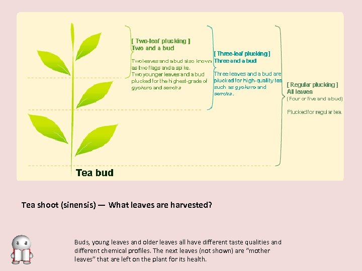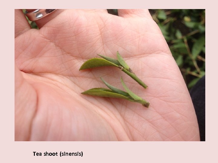 Tea shoot (sinensis) — What leaves are harvested? Buds, young leaves and older leaves all have different taste qualities and different chemical profiles. The next leaves (not shown) are “mother leaves” that are left on the plant for its health.
