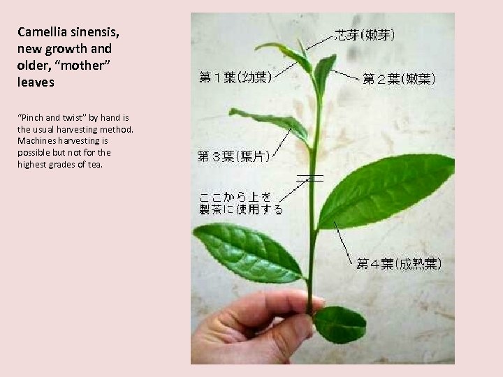 Camellia sinensis, new growth and older, “mother” leaves “Pinch and twist” by hand is the usual harvesting method. Machines harvesting is possible but not for the highest grades of tea.