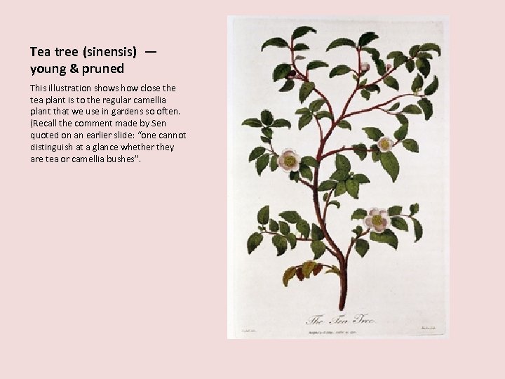 Tea tree (sinensis) — young & pruned This illustration shows how close the tea plant is to the regular camellia plant that we use in gardens so often. (Recall the comment made by Sen quoted on an earlier slide: “one cannot distinguish at a glance whether they are tea or camellia bushes”.