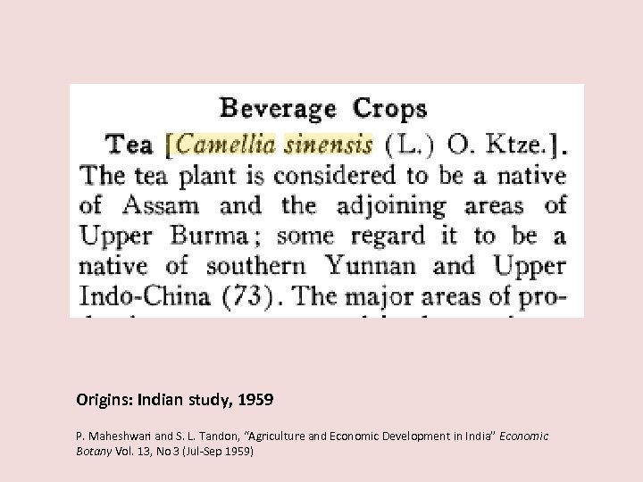 Origins: Indian study, 1959 P. Maheshwari and S. L. Tandon, “Agriculture and Economic Development in India” Economic Botany Vol. 13, No 3 (Jul-Sep 1959)