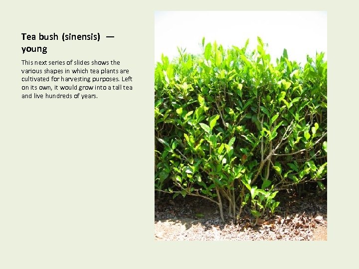 Tea bush (sinensis) — young This next series of slides shows the various shapes in which tea plants are cultivated for harvesting purposes. Left on its own, it would grow into a tall tea and live hundreds of years.