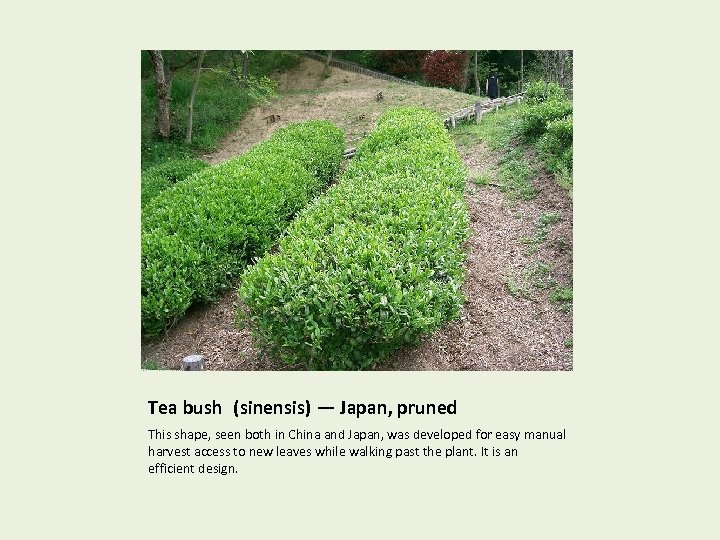 Tea bush (sinensis) — Japan, pruned This shape, seen both in China and Japan, was developed for easy manual harvest access to new leaves while walking past the plant. It is an efficient design.