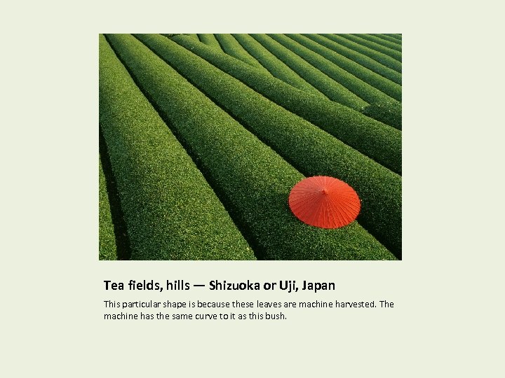 Tea fields, hills — Shizuoka or Uji, Japan This particular shape is because these leaves are machine harvested. The machine has the same curve to it as this bush.