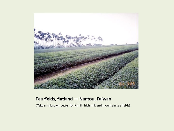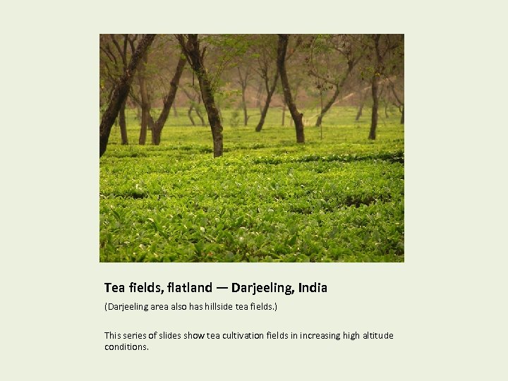 Tea fields, flatland — Darjeeling, India (Darjeeling area also has hillside tea fields. ) This series of slides show tea cultivation fields in increasing high altitude conditions.