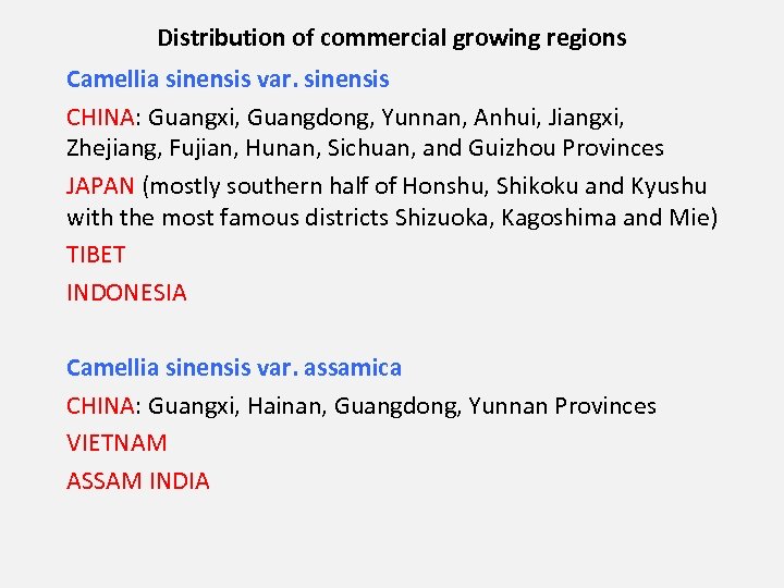 Distribution of commercial growing regions Camellia sinensis var. sinensis CHINA: Guangxi, Guangdong, Yunnan, Anhui, Jiangxi, Zhejiang, Fujian, Hunan, Sichuan, and Guizhou Provinces JAPAN (mostly southern half of Honshu, Shikoku and Kyushu with the most famous districts Shizuoka, Kagoshima and Mie) TIBET INDONESIA Camellia sinensis var. assamica CHINA: Guangxi, Hainan, Guangdong, Yunnan Provinces VIETNAM ASSAM INDIA