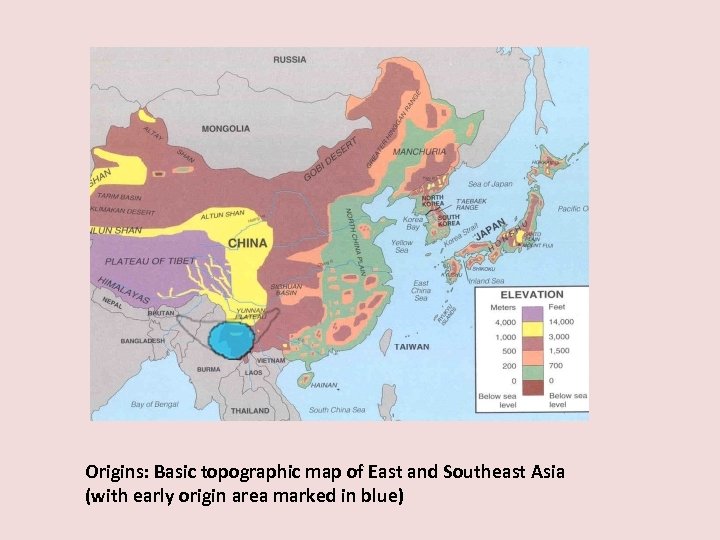 Origins: Basic topographic map of East and Southeast Asia (with early origin area marked in blue)