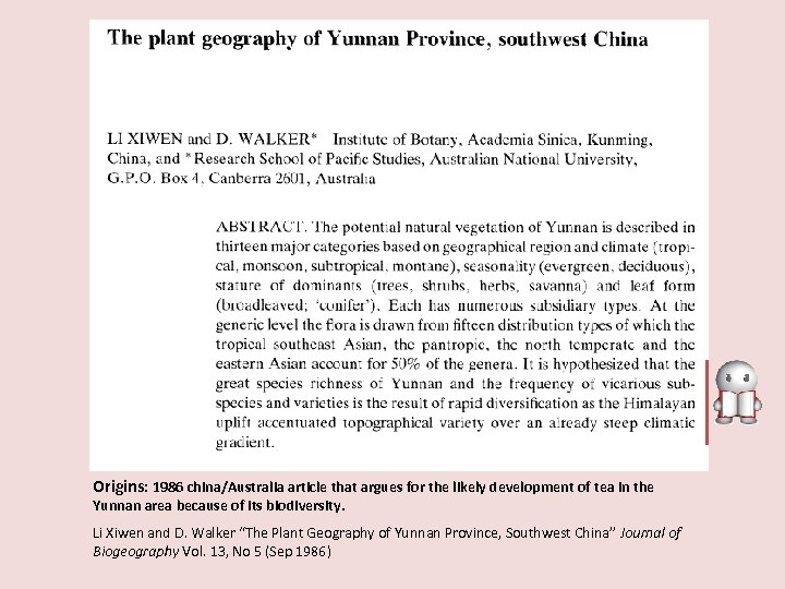 Origins: 1986 china/Australia article that argues for the likely development of tea in the Yunnan area because of its biodiversity. Li Xiwen and D. Walker “The Plant Geography of Yunnan Province, Southwest China” Journal of Biogeography Vol. 13, No 5 (Sep 1986)