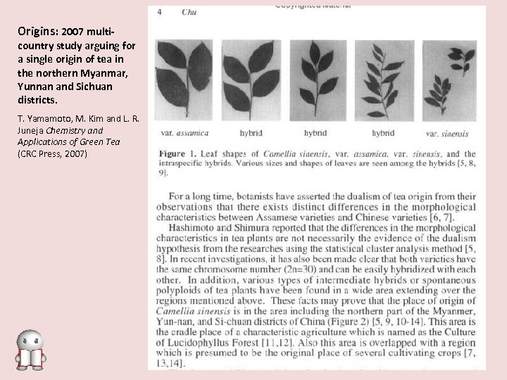 Origins: 2007 multi- country study arguing for a single origin of tea in the northern Myanmar, Yunnan and Sichuan districts. T. Yamamoto, M. Kim and L. R. Juneja Chemistry and Applications of Green Tea (CRC Press, 2007)