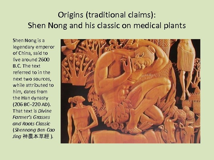 Origins (traditional claims): Shen Nong and his classic on medical plants Shen Nong is a legendary emperor of China, said to live around 2600 B. C. The text referred to in the next two sources, while attributed to him, dates from the Han dynasty (206 BC– 220 AD). That text is Divine Farmer’s Grasses and Roots Classic (Shennong Ben Cao Jing 神農本草經 ).