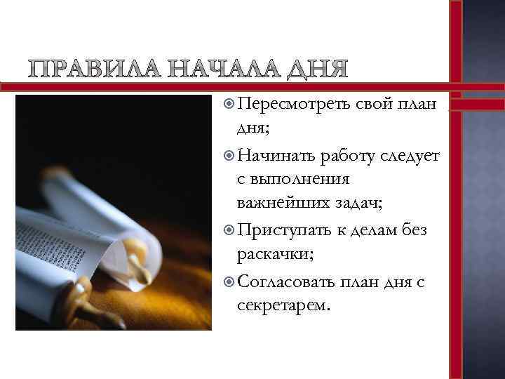 Пересмотреть свой план дня; Начинать работу следует с выполнения важнейших задач; Приступать к делам без раскачки; Согласовать план дня с секретарем.