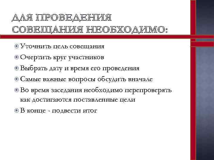 Уточнить цель совещания Очертить круг участников Выбрать дату и время его проведения Самые важные вопросы обсудить вначале Во время заседания необходимо перепроверять как достигаются поставленные цели В конце - подвести итог