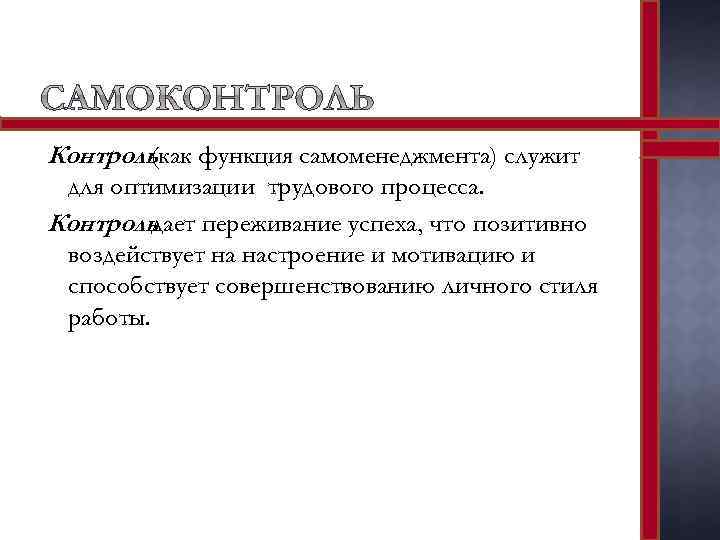 Контроль функция самоменеджмента) служит (как для оптимизации трудового процесса. Контроль дает переживание успеха, что позитивно воздействует на настроение и мотивацию и способствует совершенствованию личного стиля работы.
