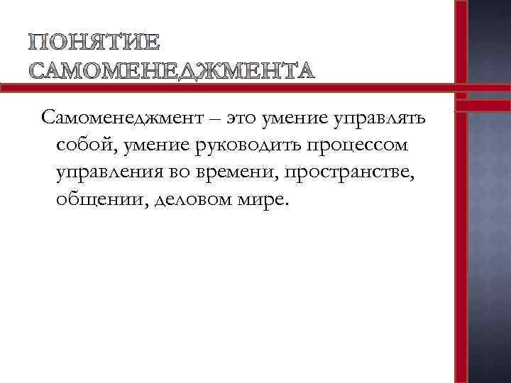 Самоменеджмент – это умение управлять собой, умение руководить процессом управления во времени, пространстве, общении, деловом мире.