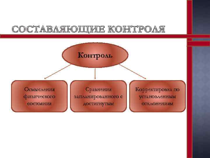 Контроль Осмысления физического состояния Сравнения запланированного с достигнутым Корректировка по установленным отклонениям