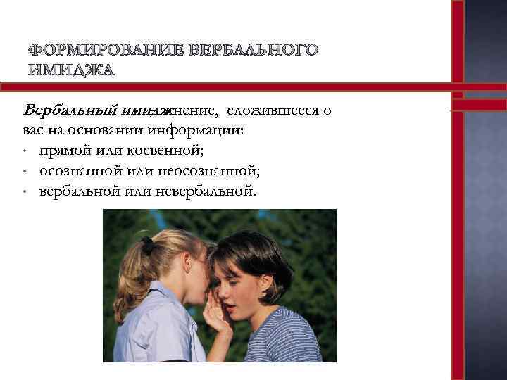 Вербальный имидж – мнение, сложившееся о вас на основании информации: • прямой или косвенной; • осознанной или неосознанной; • вербальной или невербальной.