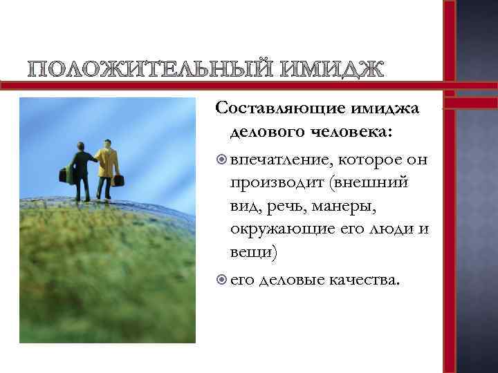 Составляющие имиджа делового человека: впечатление, которое он производит (внешний вид, речь, манеры, окружающие его люди и вещи) его деловые качества.