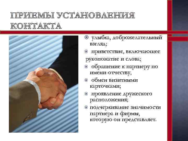 улыбка, доброжелательный взгляд; приветствие, включающее рукопожатие и слова; обращение к партнеру по имени-отчеству, обмен визитными карточками; проявление дружеского расположения; подчеркивание значимости партнера и фирмы, которую он представляет.