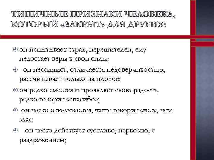 он испытывает страх, нерешителен, ему недостает веры в свои силы; он пессимист, отличается недоверчивостью, рассчитывает только на плохое; он редко смеется и проявляет свою радость, редко говорит «спасибо» ; он часто отказывается, чаще говорит «нет» , чем «да» ; он часто действует суетливо, нервозно, с раздражением;