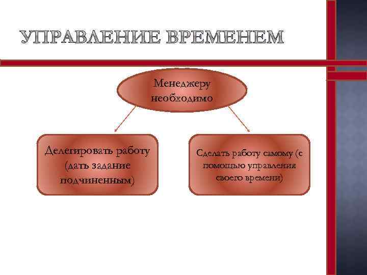 Менеджеру необходимо Делегировать работу (дать задание подчиненным) Сделать работу самому (с помощью управления своего времени)