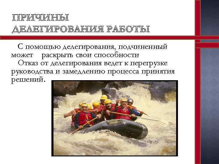 С помощью делегирования, подчиненный может раскрыть свои способности Отказ от делегирования ведет к перегрузке руководства и замедлению процесса принятия решений.