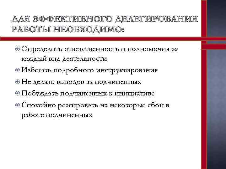 Определить ответственность и полномочия за каждый вид деятельности Избегать подробного инструктирования Не делать выводов за подчиненных Побуждать подчиненных к инициативе Спокойно реагировать на некоторые сбои в работе подчиненных