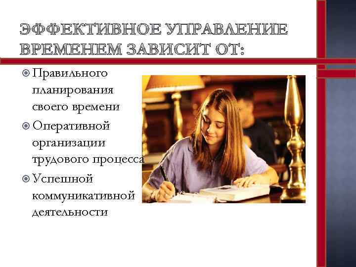 Правильного планирования своего времени Оперативной организации трудового процесса Успешной коммуникативной деятельности
