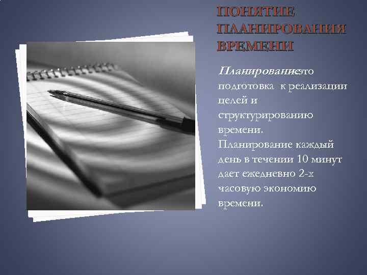 ПОНЯТИЕ ПЛАНИРОВАНИЯ ВРЕМЕНИ Планированиеэто подготовка к реализации целей и структурированию времени. Планирование каждый день в течении 10 минут дает ежедневно 2 -х часовую экономию времени.