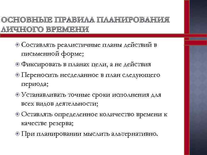 Составлять реалистичные планы действий в письменной форме; Фиксировать в планах цели, а не действия Переносить несделанное в план следующего периода; Устанавливать точные сроки исполнения для всех видов деятельности; Оставлять определенное количество времени к качестве резерва; При планировании мыслить альтернативно.