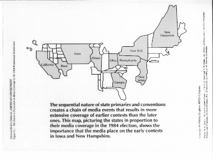 Campaigns Circa 2000 • Nominations: We see a party that has lost its power to control who is nominated to primary election voters. • Political Organization: We see a party whose monopoly of political organization has been destroyed by the rise of countless special interest groups and mass media. • Mass Media: We see a party whose control of the media has vanished under a blizzard of competition. We see voters who get most of their information from the electronic mass media in 6 -second sound bites on the network news and in 30 -second spot commercials during campaigns.