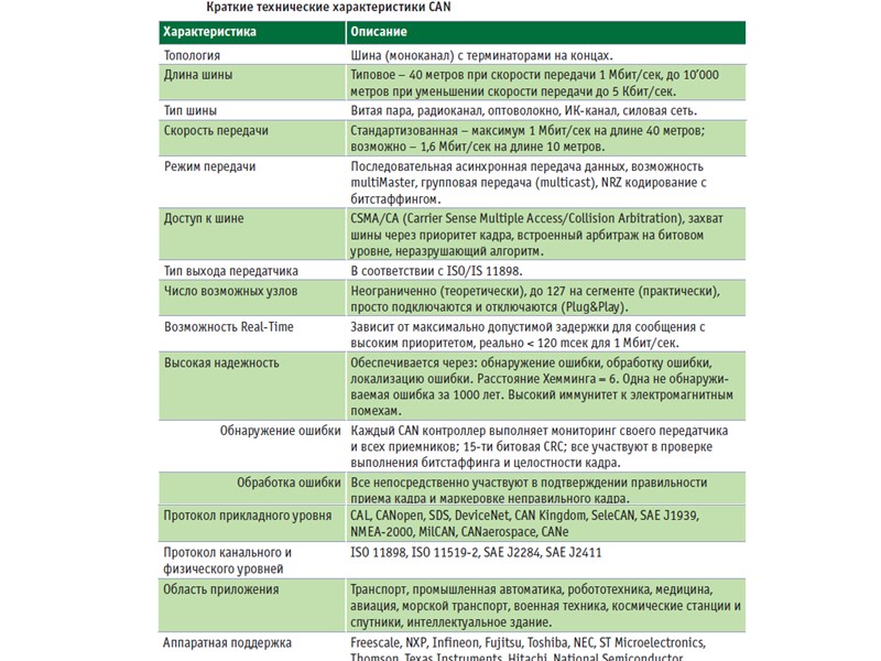 CAN характеризуется следующими основными свойствами: Каждому сообщению (а не устройству) устанавливается свой приоритет Гарантированная величина паузы между двумя актами обмена Гибкость конфигурирования и возможность модернизации системы Широковещательный прием сообщений с синхронизацией времени Допустимость нескольких ведущих устройств (многомастерная сеть) Способность к обнаружению ошибок и сигнализации об их наличии Автоматический повтор передачи сообщения, доставленных с ошибкой, сразу, как только сеть станет свободной Автоматическое различие сбоев и отказов с возможностью автоматического отключения отказавших модулей