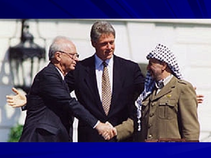 Oslo Accords – 1993 -4 Palestinians, Israel Arafat, Rabin Clinton 1 st talks between Israel & Palestinians, idea of a Palestine, Rabin assassinated