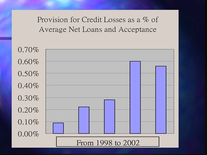 Credit Risk Includes off balance sheet n Diversify loans by type and geography n $1 billion in credit protection (2002) n $300 million in derivatives (2002) n