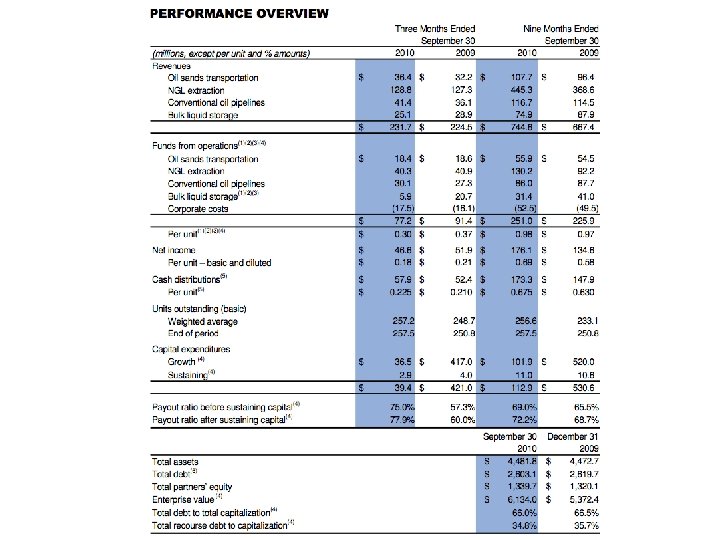 Q 3 Summary • Funds flow in the third quarter was $267 million compared to $349 million in the third quarter of 2009. The decline was primarily due to lower realized risk management gains. • Net loss was $25 million compared to a net income of $7 million in the third quarter of 2009. The decrease in net income in 2010 was mainly due to lower realized risk management gains and unrealized foreign exchange gains. • Netback was $23. 13 per boe compared to $25. 91 per boe in the third quarter of 2009. The decline was primarily due to lower realized risk management gains.