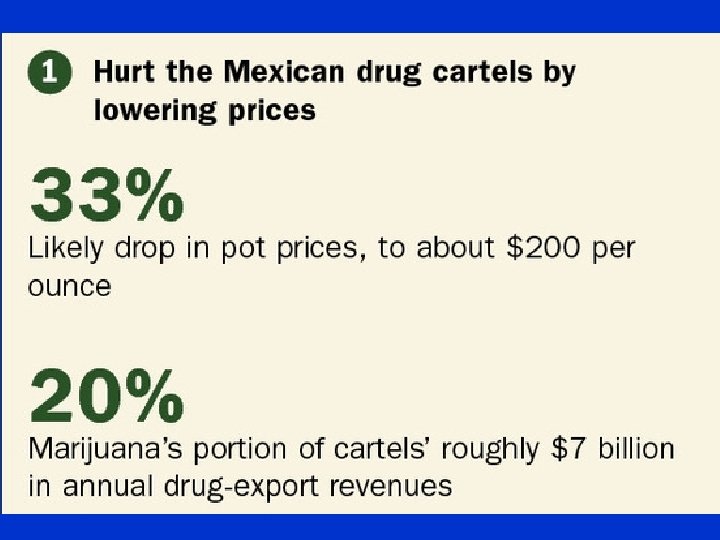 Full vs Partial Legalization • full legalization has the potential to substitute underground economies with legitimate businesses • pharmaceutical companies • agribusiness
