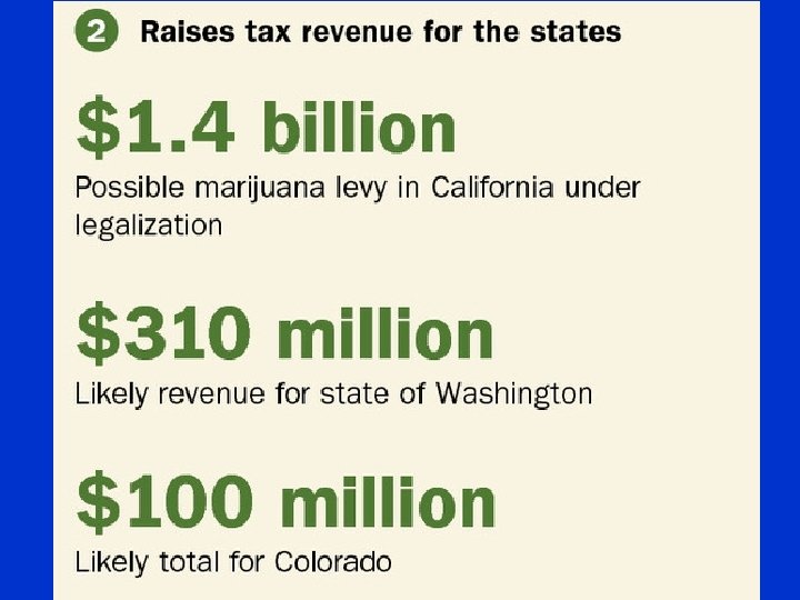 Colorado – requires the legislature to address • product labeling • security requirements for wholesale and retail marijuana establishments • workplace drug policies • marijuana impairment while driving • integrating the existing medical marijuana system into the new commercial market • 15 percent excise tax on wholesale marijuana sales