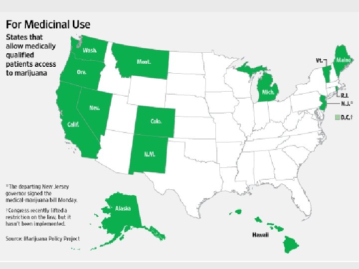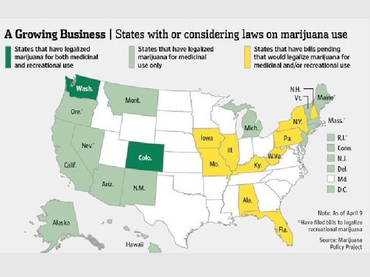 US Attorney General Response • Prevent: – distribution of cannabis to minors – revenue from going to criminal enterprises, gangs, and cartels – diversion of cannabis from states where it is legal under state law to other states – use as a cover or pretext for the trafficking of other illegal drugs or other illegal activity – violence and the use of firearms in the cultivation and distribution of cannabis – drugged driving and the exacerbation of other adverse public health consequences associated with cannabis use – growing of cannabis on public lands – cannabis possession or use on federal property Cole, J. Guidance Regarding Cannabis Enforcement August 29, 2013, Deputy Attorney General. http: //www. justice. gov/iso/opa/resources/3052013829132756857467. pdf