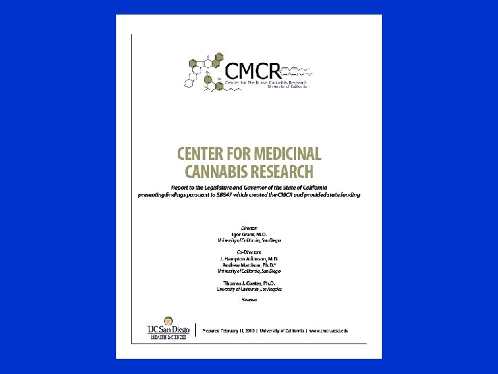 Educational Objectives · To describe the history of medical marijuana in the US from the 19 th Century to present day · To recognize partial legalization versus full legalization of marijuana · To understand the contributions of the UC Center for Medicinal Cannabis Research (CMCR) · To discuss opportunities for research