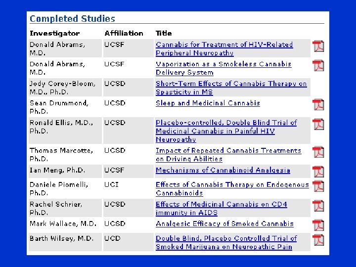 Approval Process 1997 NIH Workshop • Department of Health and Human Services (HHS) • DEA – Schedule I License • FDA – Investigational New Drug Application • NIDA – supplies marijuana grown at University of Mississippi • Research Advisory Panel of California