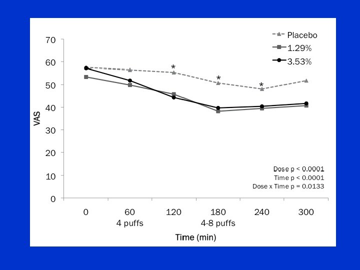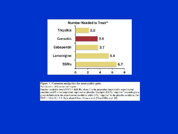 CMCR Neuropathic Pain Studies • results have been convergent – five studies demonstrated a significant decrease in pain after cannabis administration • the magnitude of effect in these studies, expressed as the number of patients needed to treat to produce one positive outcome, was comparable to current therapies